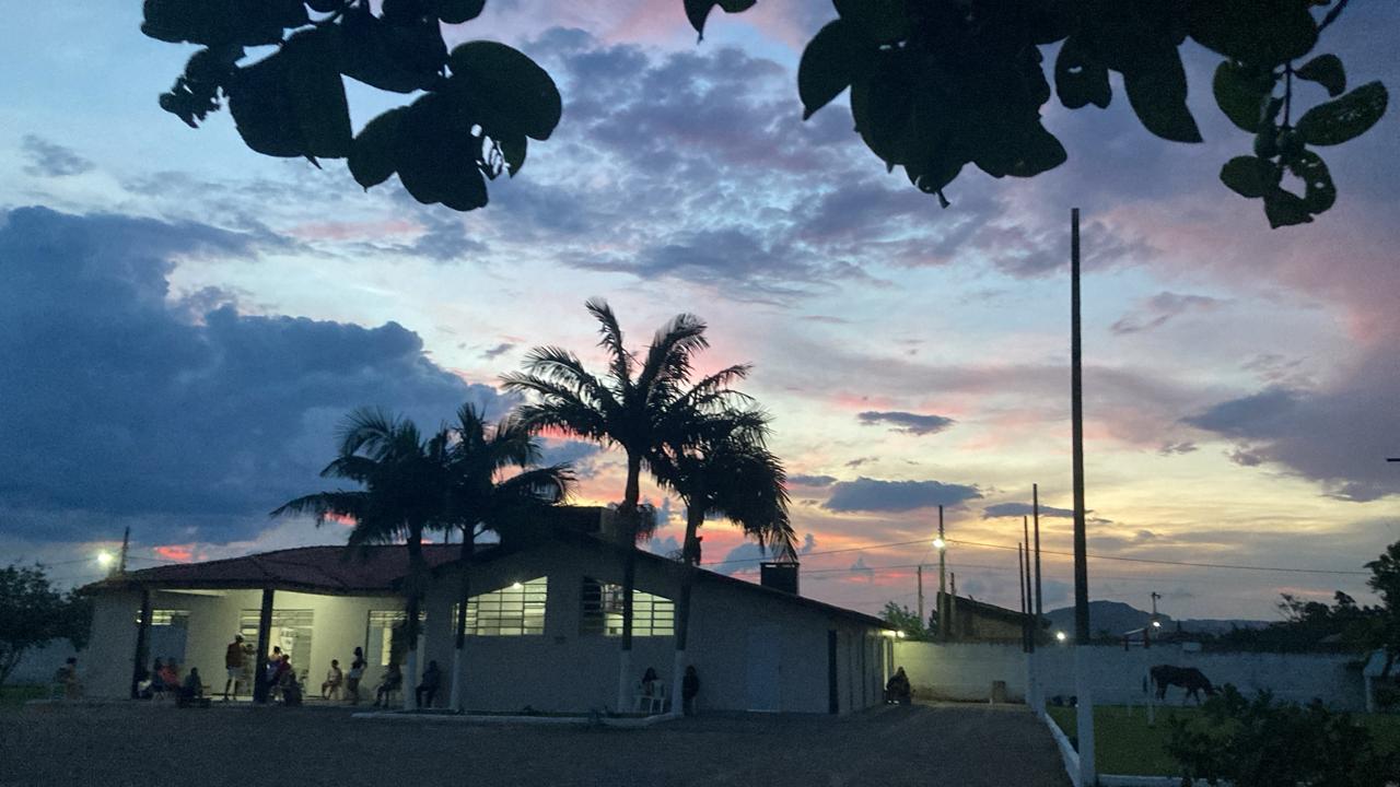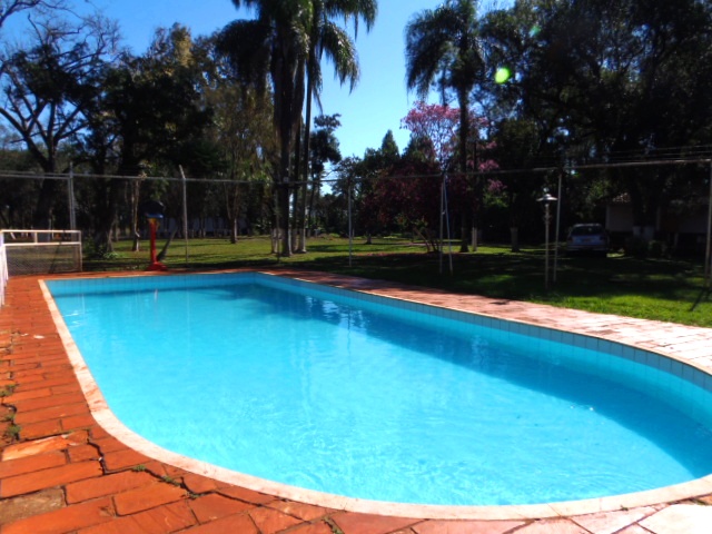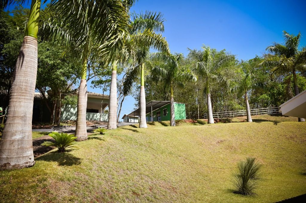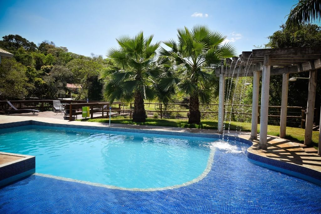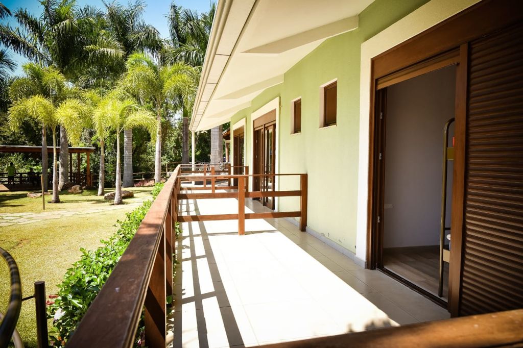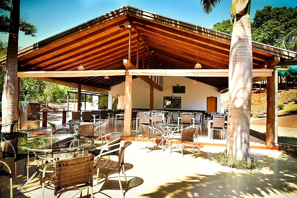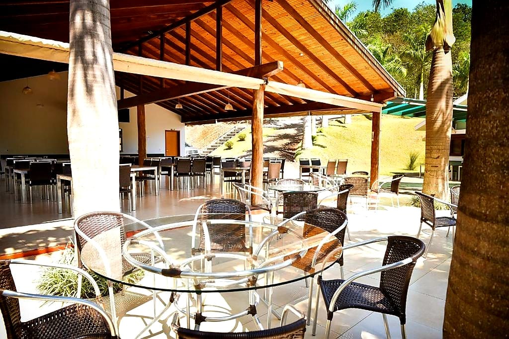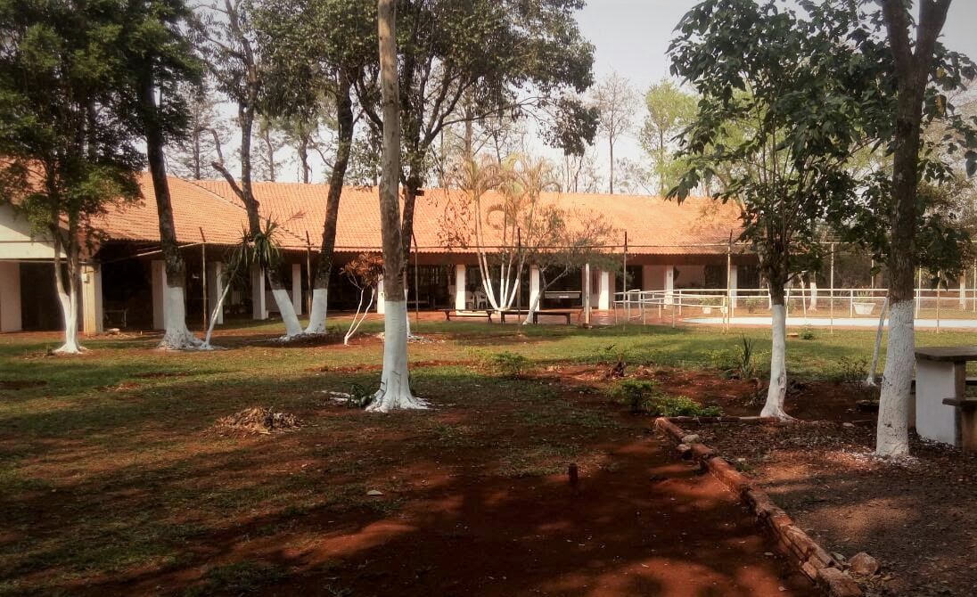 Ambientes equipados com piscina, academia, campo e quadra para esportes, refeitório, além de uma área ampla.