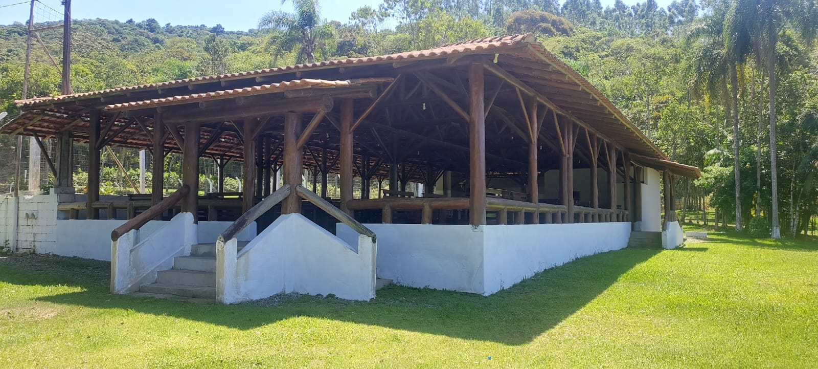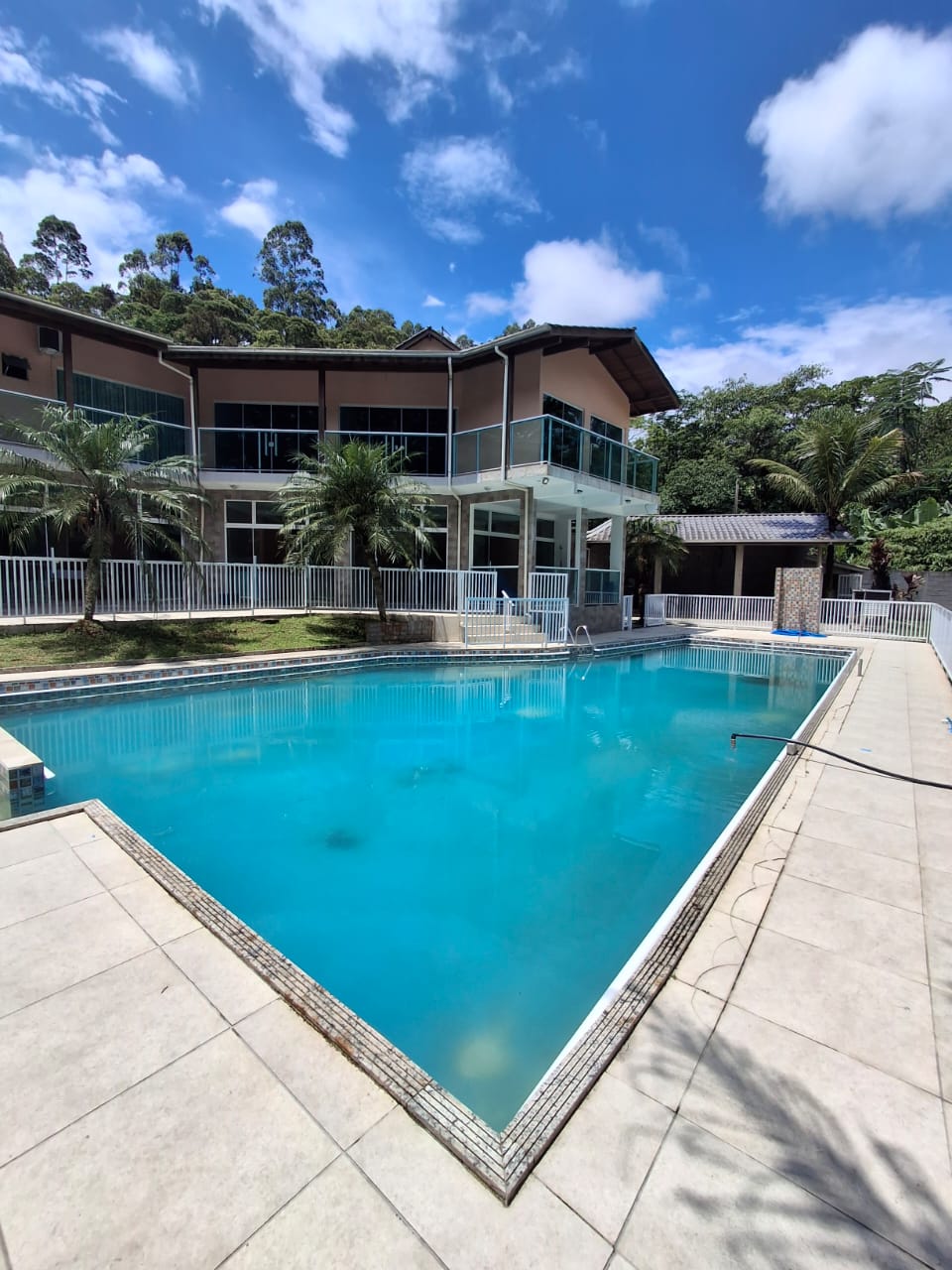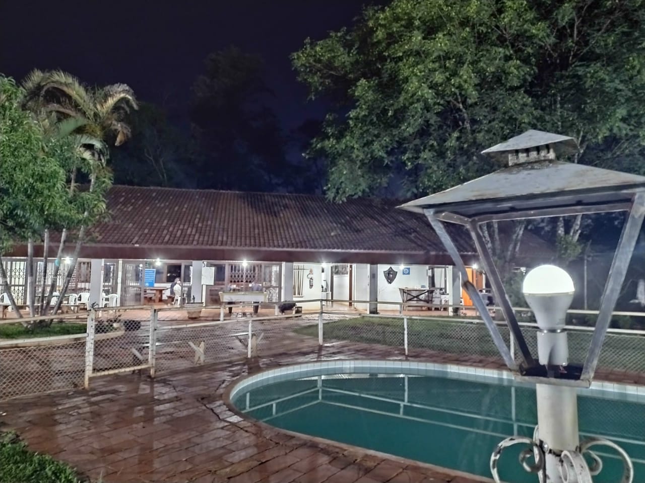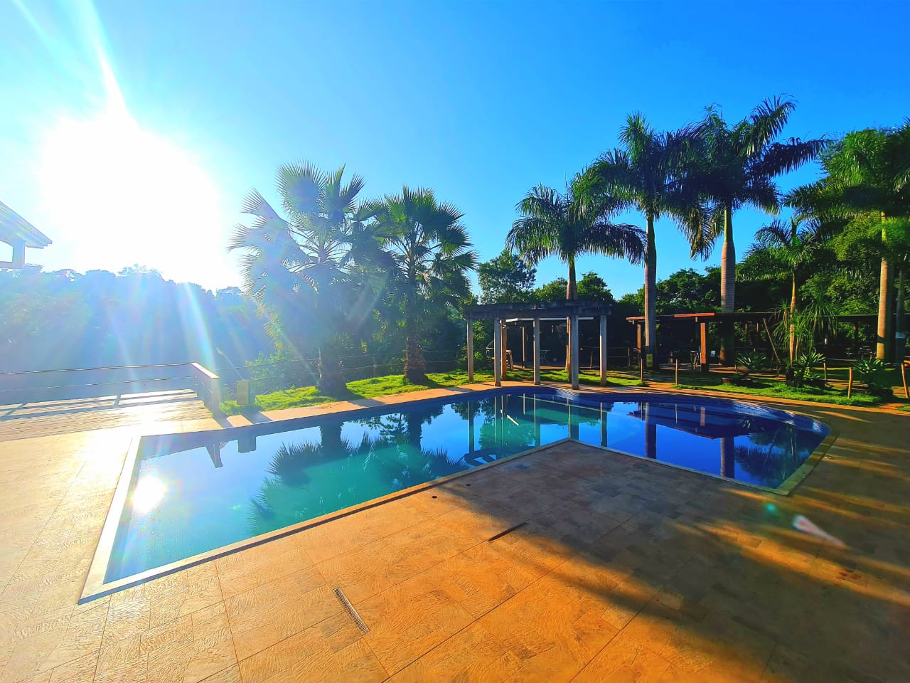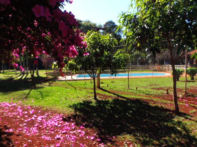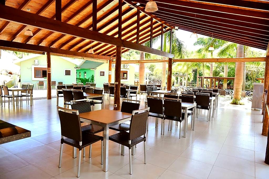 Ambientes equipados com piscina, academia, campo e quadra para esportes, refeitório, além de uma área ampla.